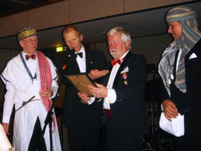 Visetrampsjefen leste kriteriene for utdelelse av vårt hedersmerke ”Den Utgåtte Støvels Orden” – og Håkan Bergstrøm ble kallet til podiet. Det sedvanlige ritualet ble høytidelig gjennomgått, og en stolt og rørt Håkan fikk støvelen festet til sitt bryst og overrakt et diplom som bekreftet hans nye status. Applausen braket løs og vi hadde nok en gang på en utmerket måte klart å sette vårt preg på et nordisk møte.