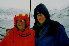 På tilbaketuren til Harstad hadde vi kraftig sjø – kuling, storm, kanskje orkan for alt jeg vet. Tallerkener og kjøkkentøy fløy veggimellom og klubbmedlemmer ramlet ut av køyene sine. Vi red på kong Neptuns mektige rygg mens hans raseri frådet om bauen.